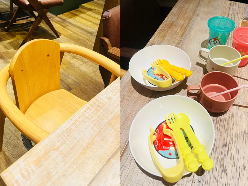 当店では安全に配慮したお子様用の椅子や食器(コップ、ストロー、お椀、スプーン、フォーク)をご用意。
